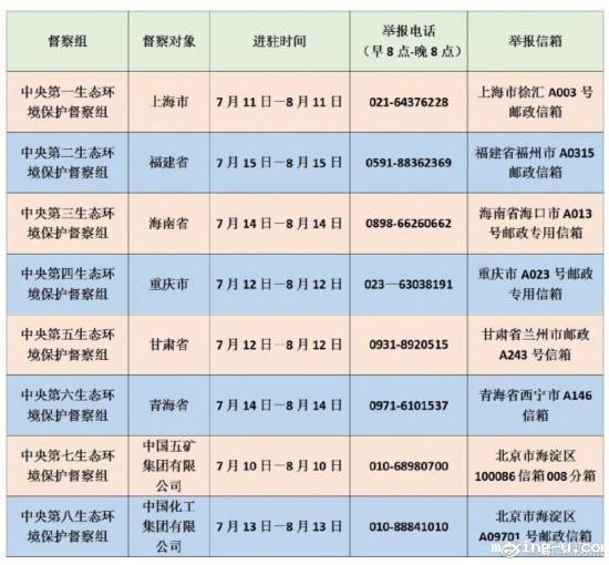 进驻期间,各督察组将分别设立联系电话和邮政信箱,受理被督察对象生态环境保护方面的来信来电举报。具体举报方式如下表: